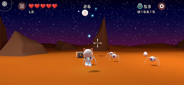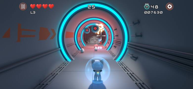 По сути, в «AstroCat Adventures» нет конца, и главная цель – набрать больше очков. Уровни собираются из различных локаций случайным образом, равно как и наполнение этих локаций. На данный момент нельзя сказать, что их много, так что в один забег вы сможете увидеть различные коридоры по несколько раз. Но все равно, приятно, что они чередуются, а иногда можно даже на поверхность планеты спуститься.