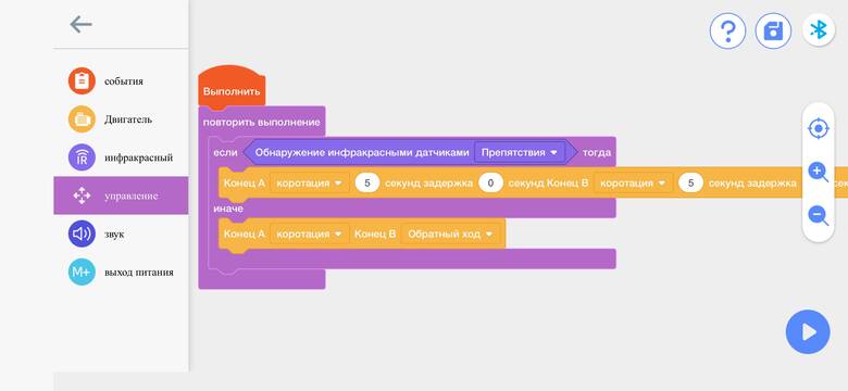 Вариант с программированием позволяет роботу выполнять установленные команды без вашего участия. К примеру, в программе управления «луноходом» на скриншоте, он движется вперед, пока инфракрасные сенсоры в соответствующем блоке, не увидят перед собой препятствие, после чего робот разворачивается и едет дальше. Так может продолжаться, пока не сядут аккумуляторы или пока вы не остановите программу.