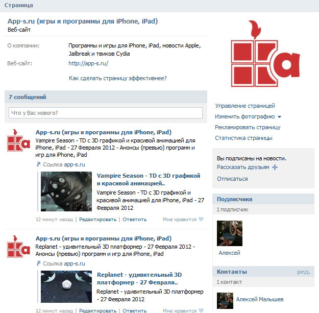 Уважаемые посетители app-s.ru, обращаю Ваше внимание на то, что теперь новости с сайта не будут транслироваться в группу "Вконаткте". Теперь мы будем опубликовывать анонсы на все новости на официальную страницу сайта в этой социальной сети, которая находится по адресу vk.com/app_s . Подписывайтесь на нашу страницу и следите за новостями игр и программ для iPhone, iPad, так же скидок в App Store и новых твиков Cydia в фиде. Теперь я буду стараться подбирать иконку к каждой новости, что сделает чтение новостей приятнее. Кнопка, ведущая на страницу, по прежнему вверху правой колонки, под текстом "Следите за новостями".