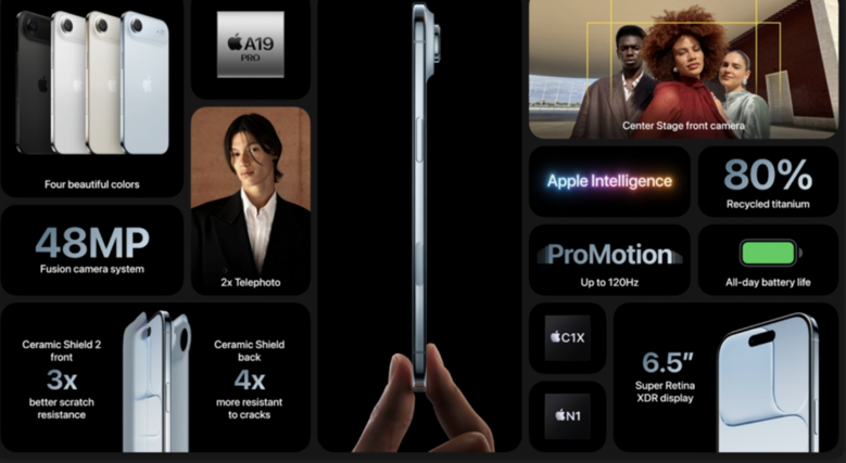 Ну и главные флагманы iPhone 17 Pro/Max. Экран у младшей модели 6,3 дюйма, а у старшей – 6,9. Внутри, как и у модели Air, бьется чип А19 Pro с шестью ядрами производительности и 6 графическими ядрами