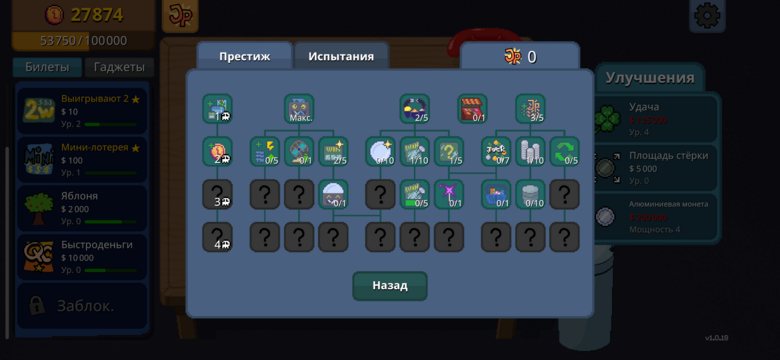 Причем, чем дороже билет, тем больше выплаты, но и шансов проиграть больше, примерно как в реальной жизни. Но есть и важные отличия: во-первых, вы не проигрываете настоящие деньги, а во-вторых, вы можете прокачать свою удачу. Чем выше уровень вашей удачи, тем больше шансов выпадения выигрыша и джекпота.