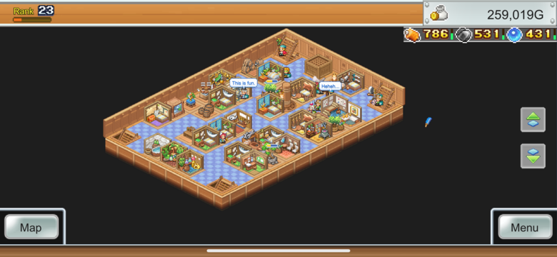 Здесь вас ждет типичный Kairosoft, то есть, строить вы будете на двух палубах, не загораживая проходы. Построек много, но в основном они нужны либо для прокачки персонажей, либо для отдыха.